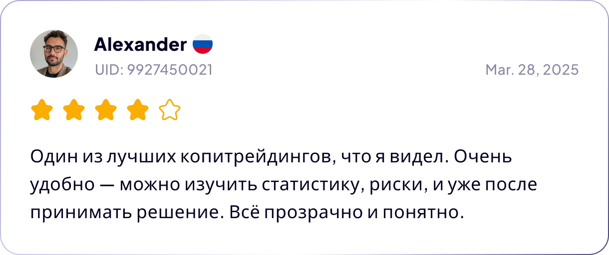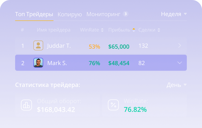 Выбирайте трейдера из динамичного списка, исходя из его реальной статистики на платформе.